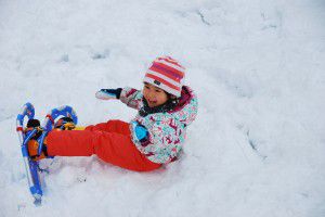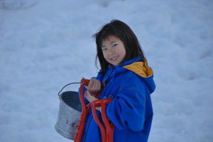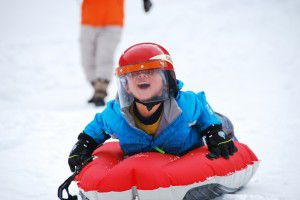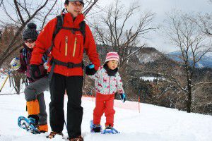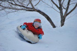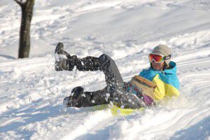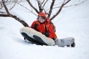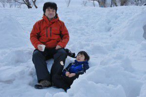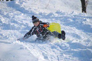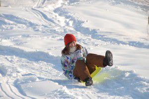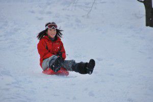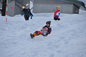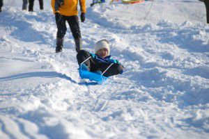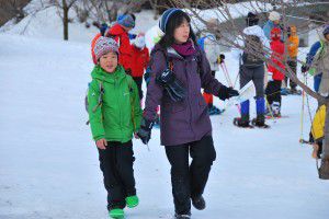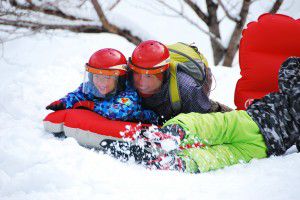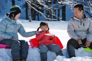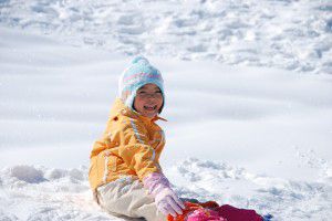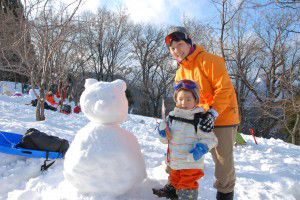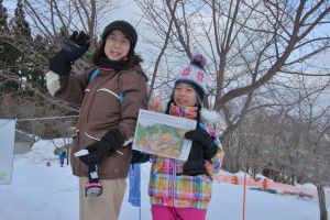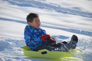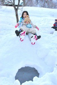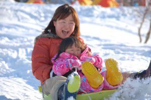 ソリを楽しむ親子、お母さんの笑顔が素敵♪