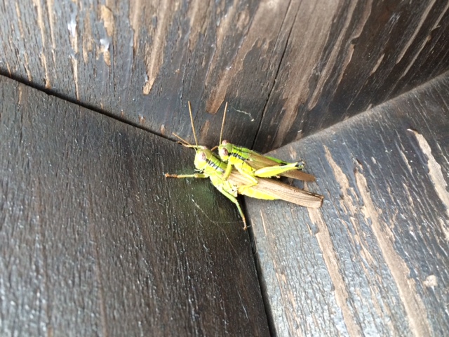 とちのき村のキャンプ場を歩くといつもバッタやらカエルやらカマドウマなどがぴょんぴょん跳んでいます。いつも子ども達に追っかけられて疲れたのかバッタの子どもが親バッタにおんぶしてもらって休憩していました。とっても可愛かったです。
