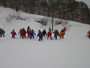 今日も雪模様。はらはらと雪舞い落ちる中、スノーシューハイクに出かけました。雪原を駆けたり、
