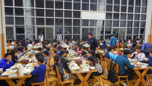 夜は天体観測を予定していましたが天候が安定しないため明日に振り替え、体育館で「公式雪合戦」というスポーツを行いました。それぞれのチームが思いっきり体を動かし、大盛り上がりとなりました。