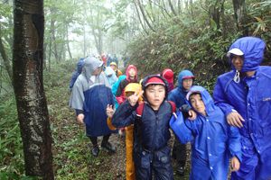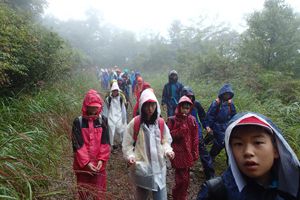 今日のプログラムは登山です!空は雨模様でしたがカッパを着て荷物を整えて出発です!風も吹きなかなか険しい道のりでしたが、みんなお互いに励まし合って