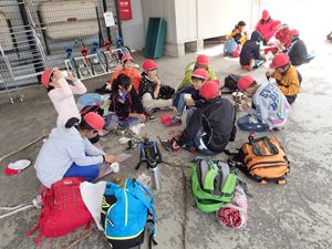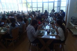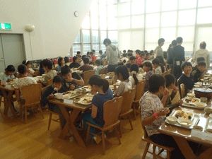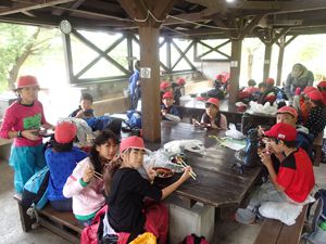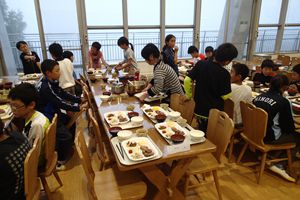 お昼前に無事に美方高原自然の家に到着しました。青空の下でお昼ご飯をたべた後開校式をしました。いよいよ自然学校の始まりです。