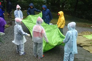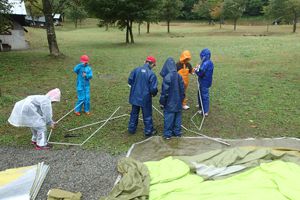 今日は朝ごはんを食べてテント撤収です。雨が降ったりやんだりの天気でしたがカッパを着てグループごとに協力してテントをかたずけました!