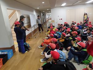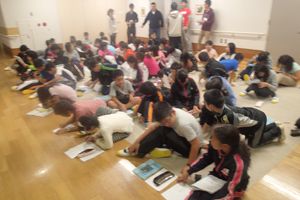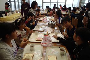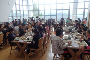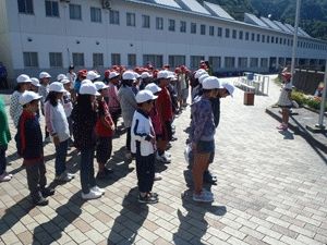 荷物整理と施設の説明をうけて、武庫北小学校との対面式をしました。どちらの学校も元気よく校歌を歌っていました。