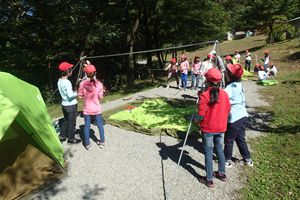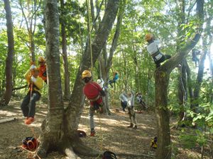 今日もとってもいい天気で自然学校2日目が始まりました。みんな朝ごはんをしっかり食べて活動開始です!今日のプログラムはクラスごとでツリーイングとテント設営の交代プログラムでした。