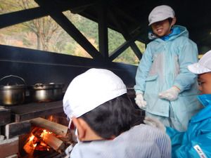 お昼ごはんのおいしいカレーを作るために、班で協力して、火おこしから調理まで全て児童たちで行いました。