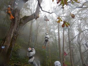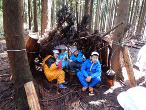 午前中は昨日に引き続き、クラスごとのプログラム(1組:基地づくり、2組:ツリーイング、3組:焼板づくり)を行いました。