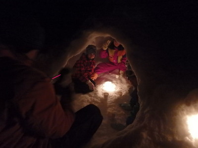 ガンガンと掘り進めていき、夜のナイトキャンドル用にデコレーションをして、かまくらの完成です!