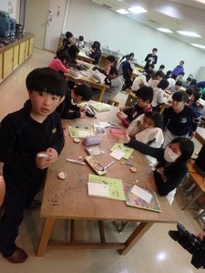 夜は明日のかまくらづくりの説明、その後にはがきタイムと木の名札づくり。