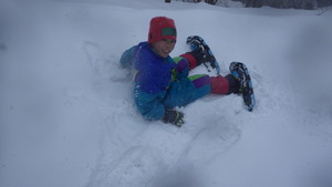 スノーシューハイクでは、キャンプ場の雪深い場所へ行き、おもいっきり走ったり、動物の足跡を探したりなどして楽しみました。