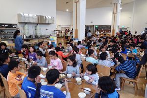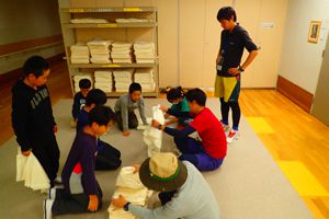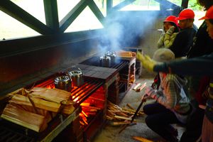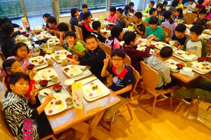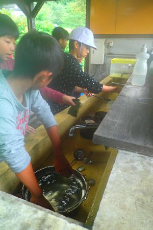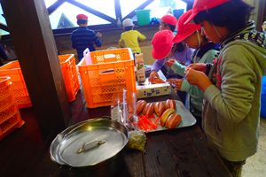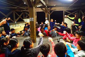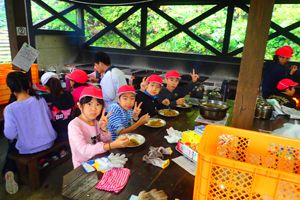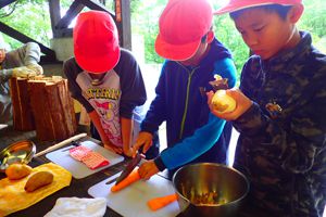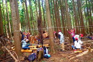 今日も気持ちのいい天気です。午前中はみんなで施設の周りを散策するオリエンテーリング。先生たちが作ってくれたビンゴカードにも挑戦しました。午後からはクラスごとの活動です。ツリーイングと沢登り、基地つくりに分かれました。たくさん活動をした後はの夕飯はシカのすき焼き!!みんなあっという間に食べてしまいました。