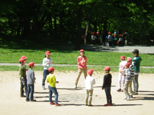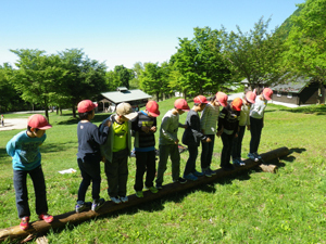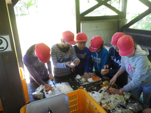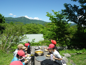 今日も朝から快晴です。班ごとにキャンプ場でカレーライスをつくり、午後は仲間と協力して行うゲームを行いました。